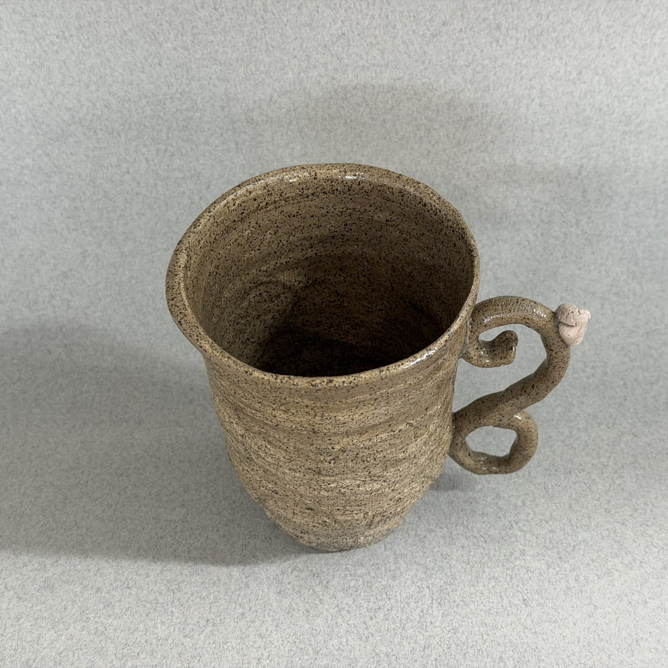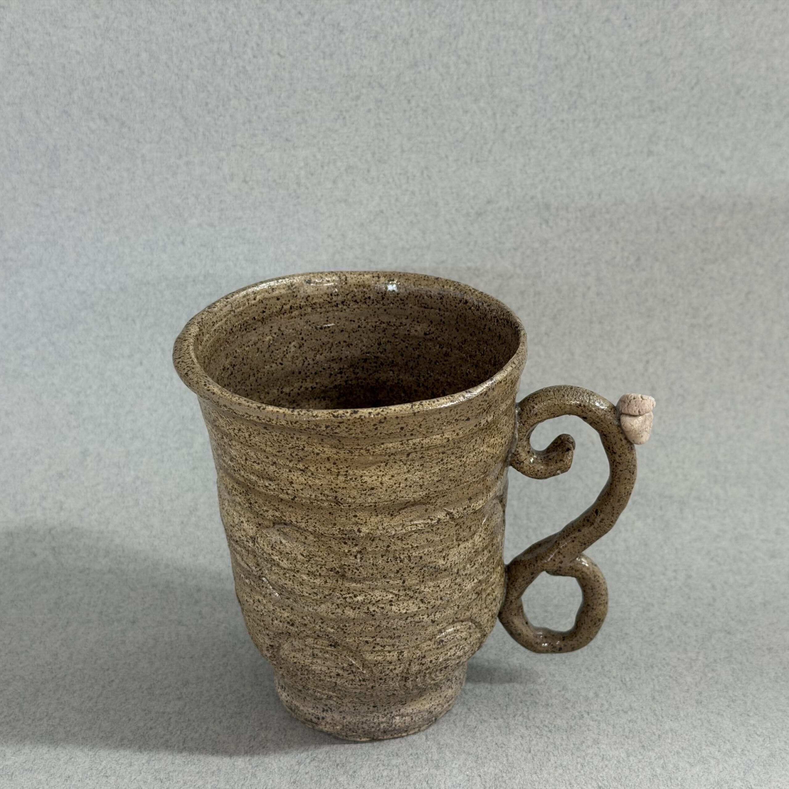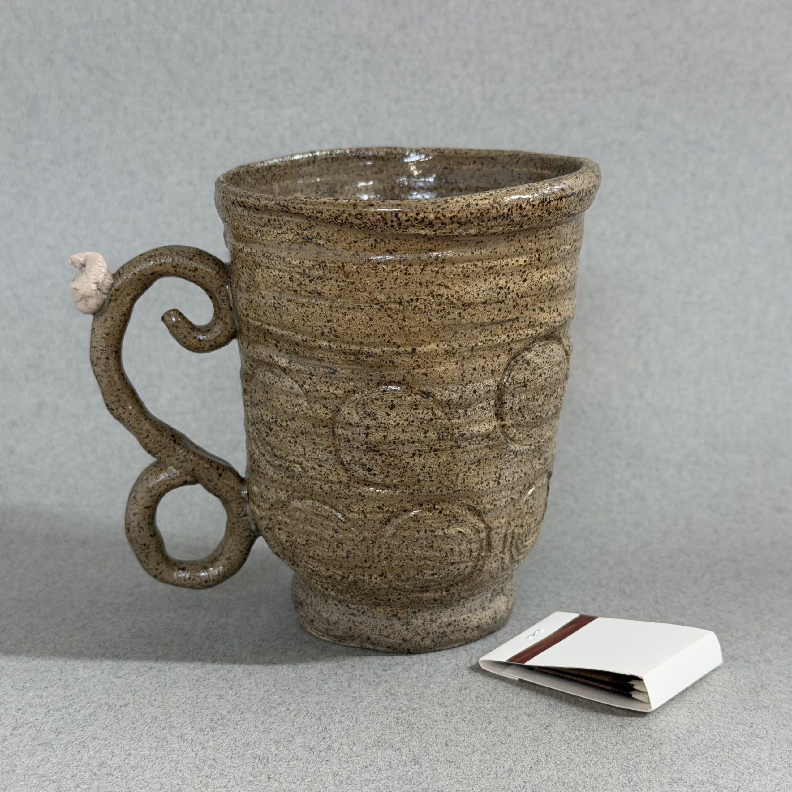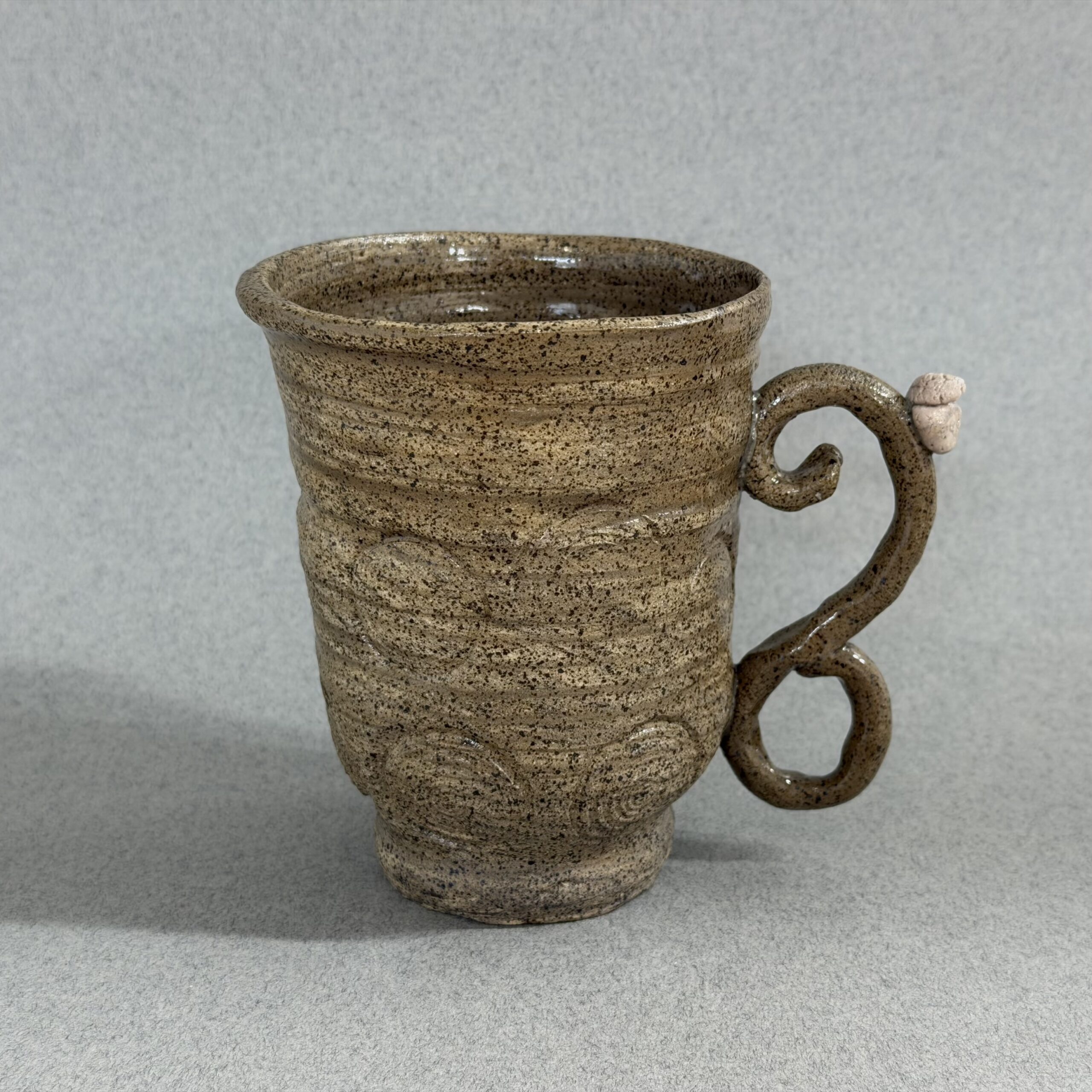 A Brown Speckled Mug with Stamped circles This mug feels great in your hand and is excellent for your morning cup of coffee!