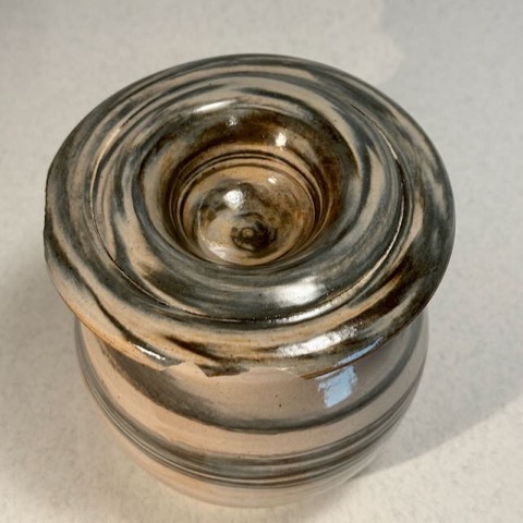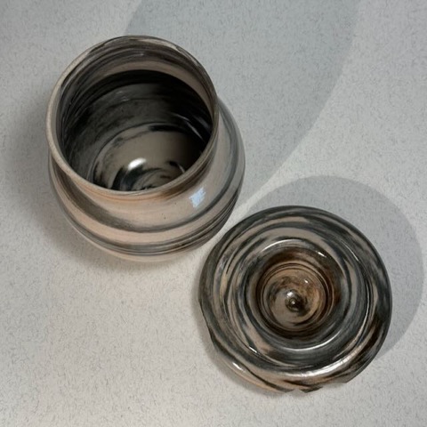 A small urn-like jar, swirl decorated jar designed to display commemoration. The lid is chipped and cracked from production.