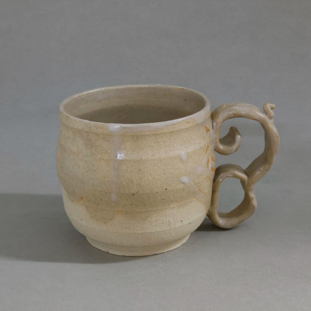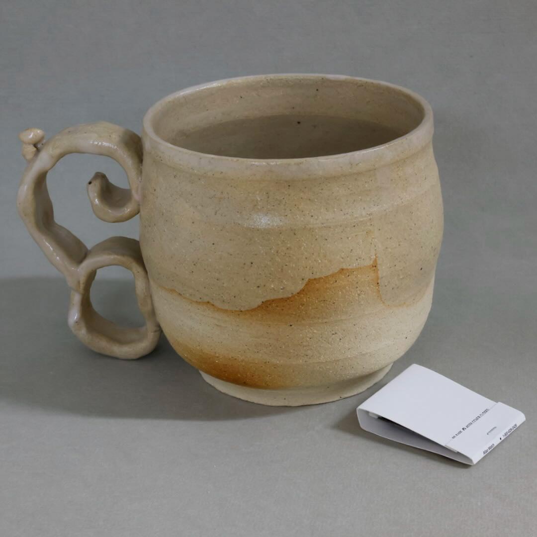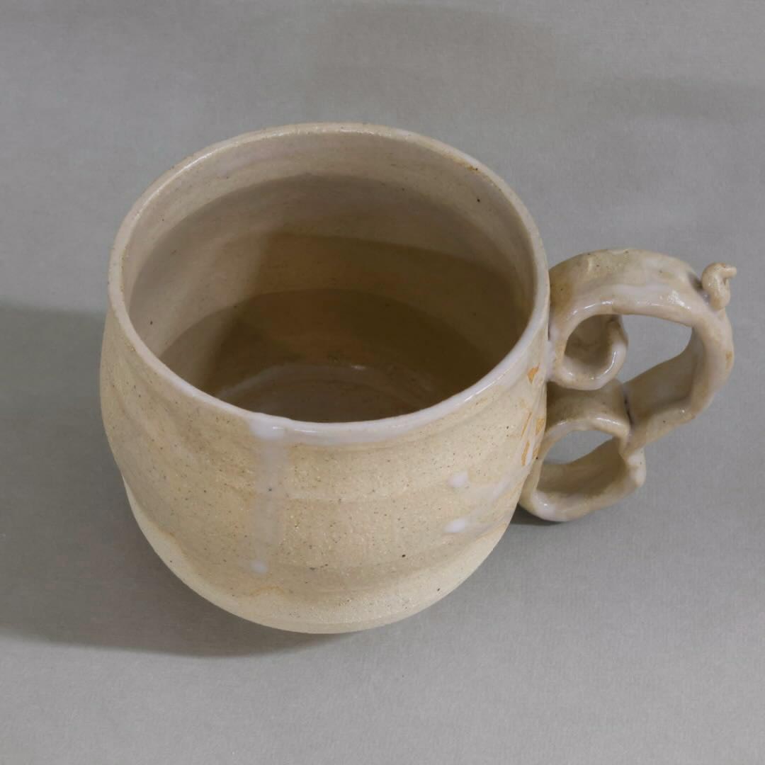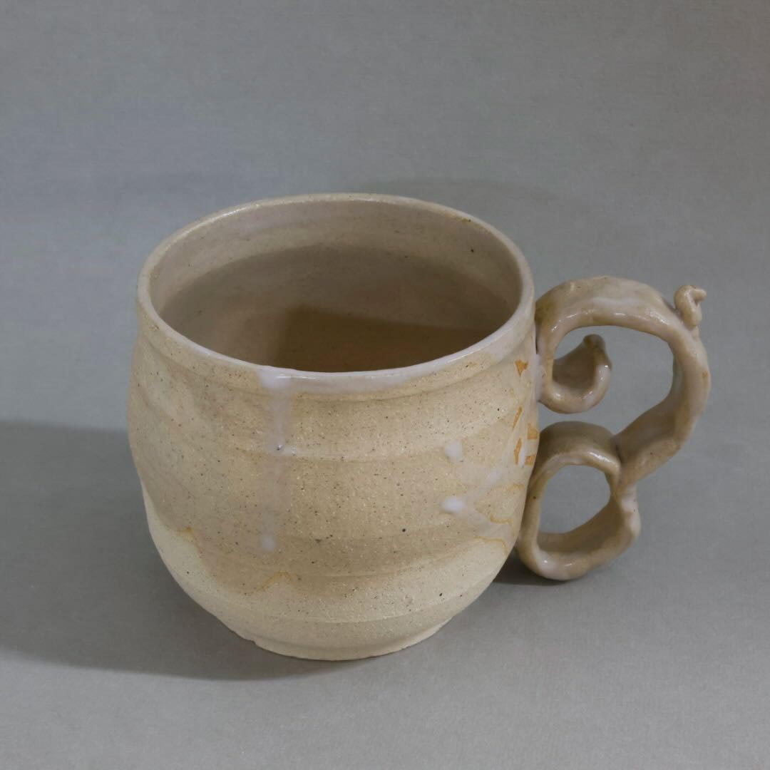 This wide mug features a funky yet functional handle