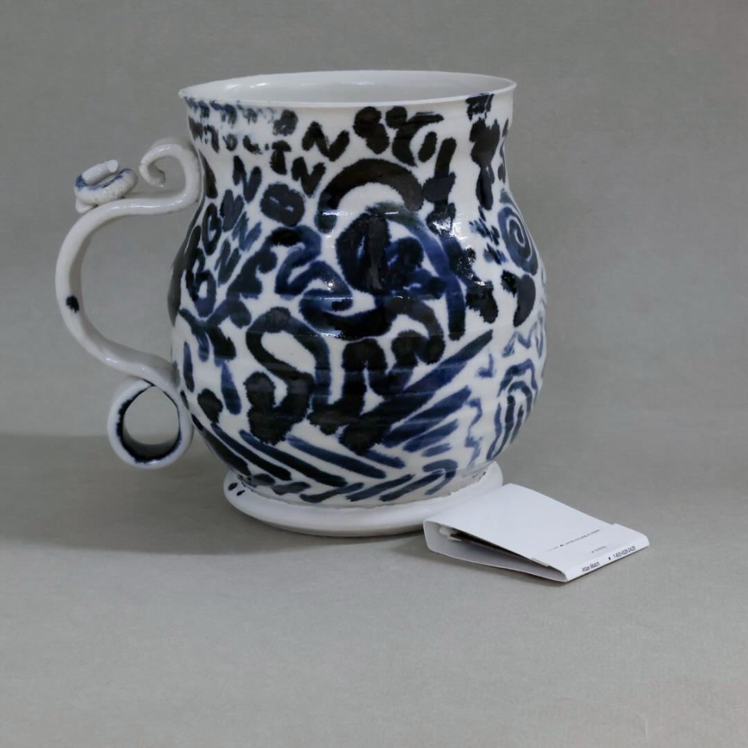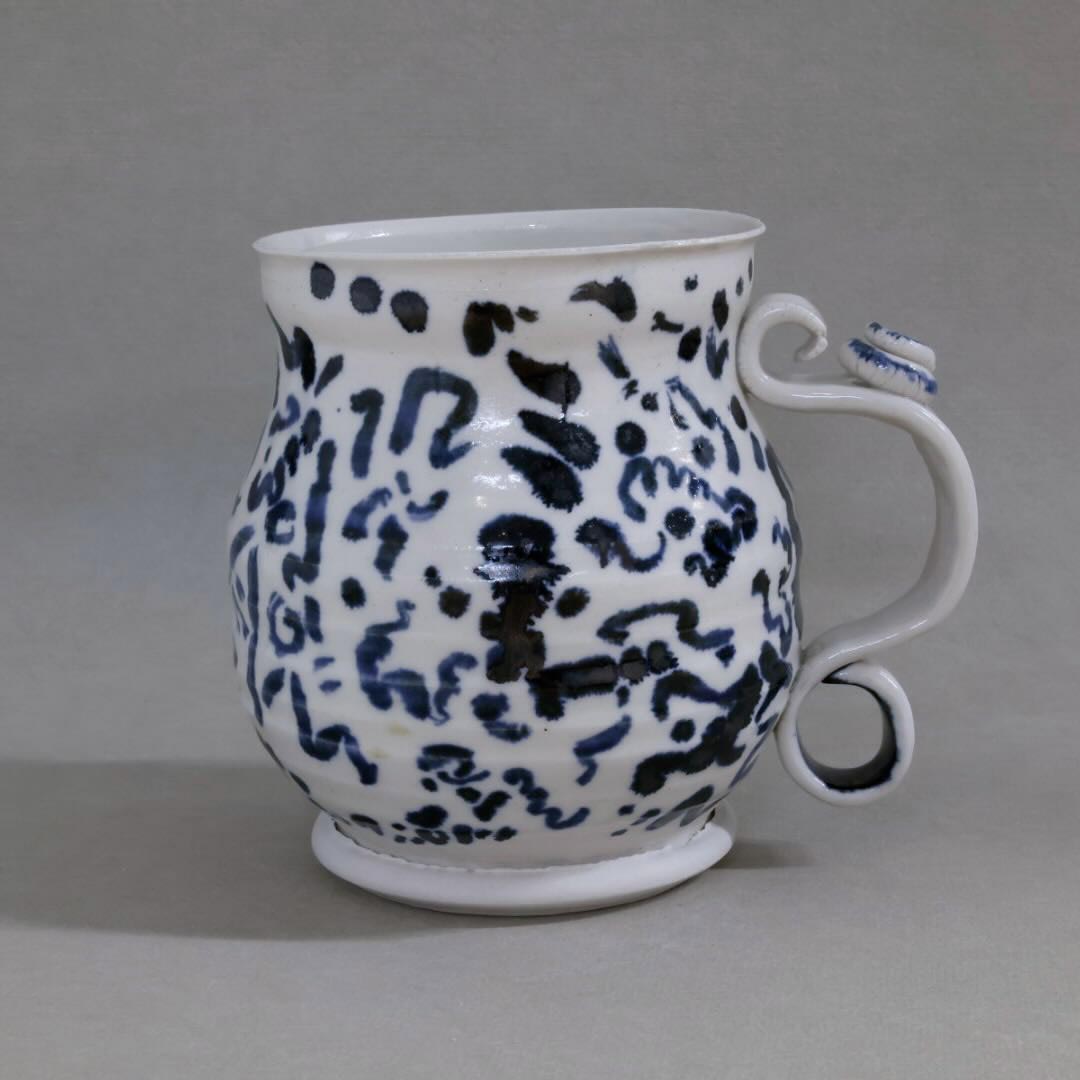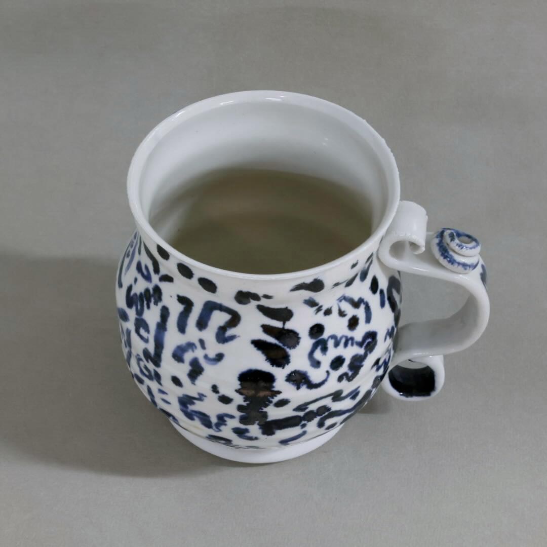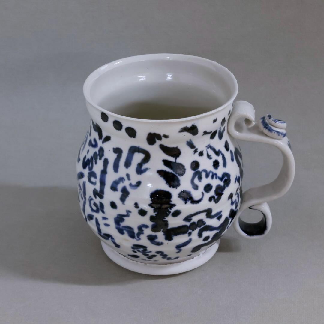 This mug has a unique blue/metalic scrawl decorating it.