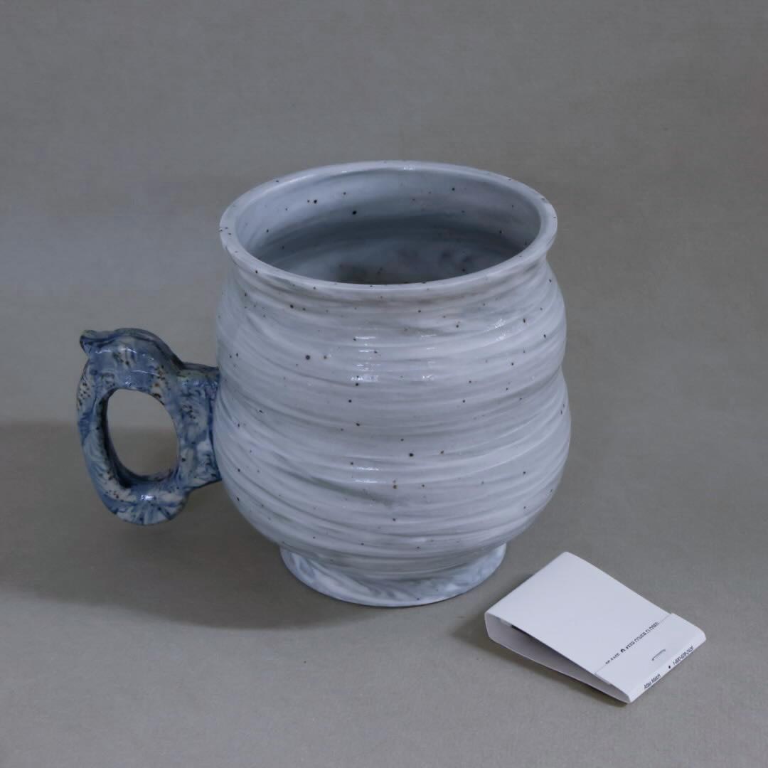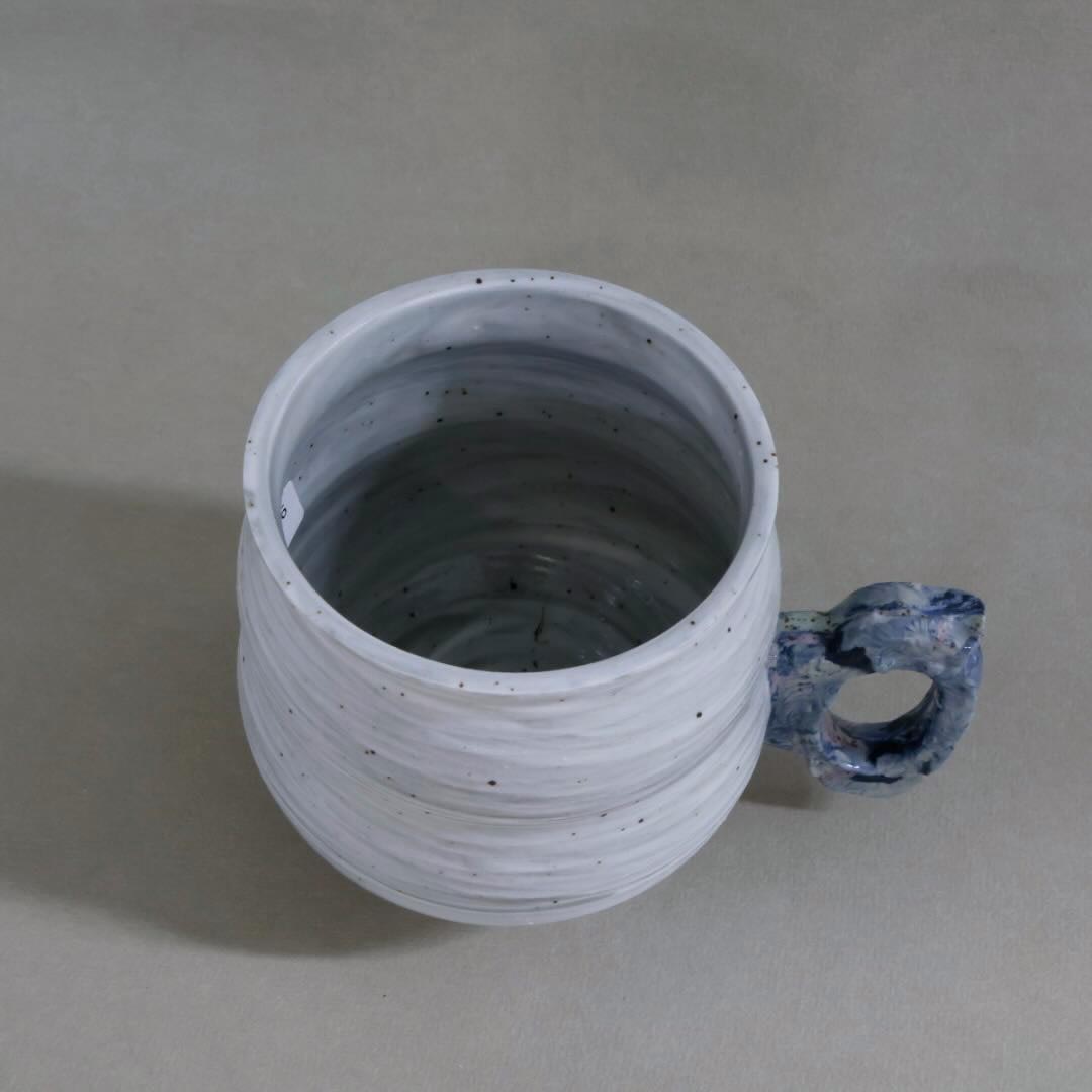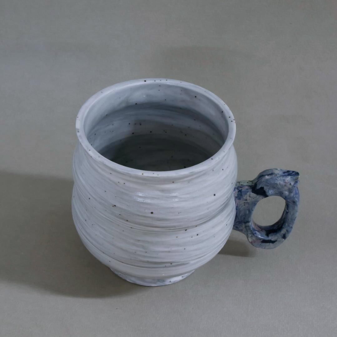 This Mug is a swirl of grey porcelain with freckles and a fancy press-molded handle